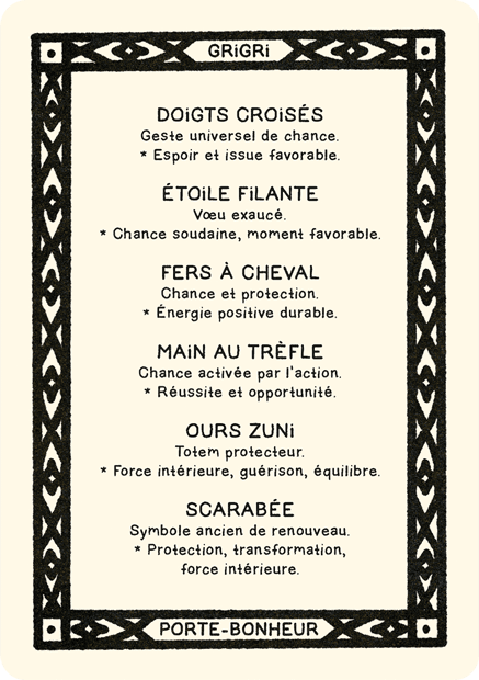 * Ange : Protection spirituelle. Guidance et bienveillance. * Champignon : Chance inattendue et magie naturelle. Surprises positives, protection discrète. * Chat porte-bonheur (Maneki-neko) : Chance et prospérité. Attire réussite et bonnes rencontres. * Chien (Matcho) : Fidélité et protection. Relations sûres et confiance. * Clé : Ouverture et solutions. Débloque les opportunités. * Cœur sacré : Amour protecteur et courage du cœur. Guérison émotionnelle. * Doigts croisés : Geste universel de chance. Espoir et issue favorable. * Étoile filante : Vœu exaucé. Chance soudaine, moment favorable. * Fers à cheval : Chance et protection. Énergie positive durable. * Main au trèfle : Chance activée par l’action. Réussite et opportunité. * Ours Zuni : Totem protecteur. Force intérieure, guérison, équilibre. * Scarabée : Symbole ancien de renouveau. Protection, transformation, force intérieure.